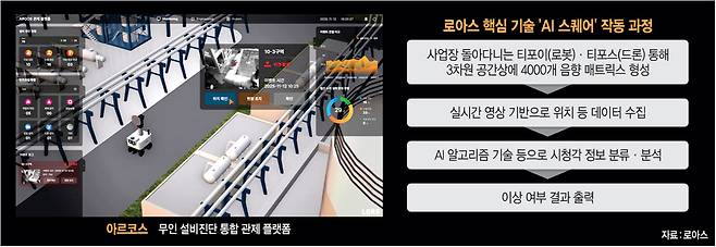 로아스의 핵심 솔루션은 무인 설비진단 통합 관제 플랫폼 ‘아르코스’다. 아르코스는 음향 검사 소프트웨어 엔진 ‘AI 스퀘어’를 기반으로 설계됐다. 다채널 마이크로폰 센서와 광학 카메라를 탑재한 로아스 자체 개발 로봇이나 드론이 공장을 돌아다니면서 음향 정보를 수집해 오작동으로 인한 사고를 알려주는 방식이다.