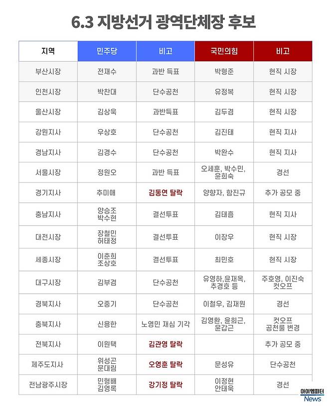 이외에도 대전(이장우), 충남(김태흠)은 국민의힘이 현역 단체장을 단수 공천하며 일찌감치 후보를 확정 지었습니다. 이에 맞서 민주당은 대전(장철민·허태정), 충남(박수현·양승조)에서 결선 투표를 진행 중입니다.