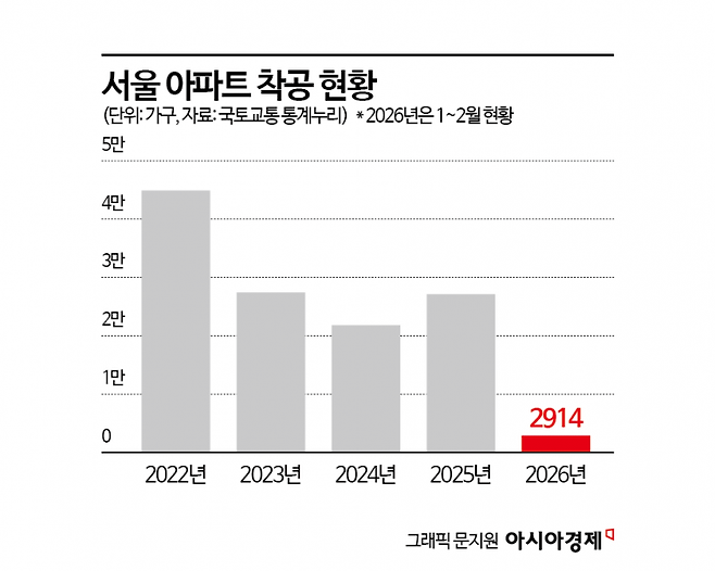 민간 분양이 지지부진한 상황에서 상대적으로 가격이 저렴한 공공 분양까지 줄어들면 서울에서 내 집을 마련하기는 어려워진다. 가뜩이나 주택 공급이 수요를 밑도는 상황에서 분양 감소 문제는 집값을 끌어올릴 수 있는 뇌관이 될 수 있다. 분양 물량을 가늠해볼 수 있는 착공은 이전보다 감소했다. 국토교통 통계누리 자료를 보면 서울 아파트 착공 실적은 2022년 4만4894가구를 기록한 이후 2023년 2만7426가구, 2024년 2만1821가구, 지난해 2만7134가구 등 최근 3년간 평균이 2만가구 수준으로 줄었다. 착공 이후 준공까지 통상 3년 이상 소요된다고 봤을 때 공급이 늘어날 가능성은 크지 않아 보인다.