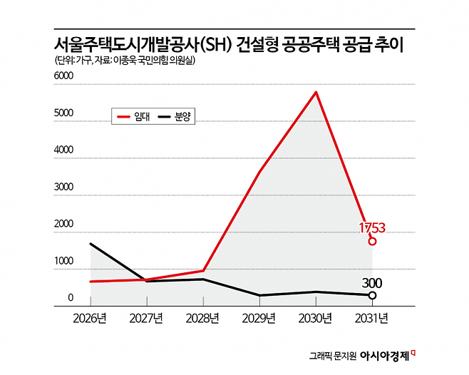 13일 이종욱 국민의힘 의원실이 서울주택도시개발공사(SH)에서 제출받은 '2026~2031년 SH의 건설형 주택공급 계획'을 보면 공공주택 공급 물량은 올해 2352가구에서 내년 1391가구로 떨어진 후 다시 상승해 2030년엔 6172가구에 달할 전망이다.