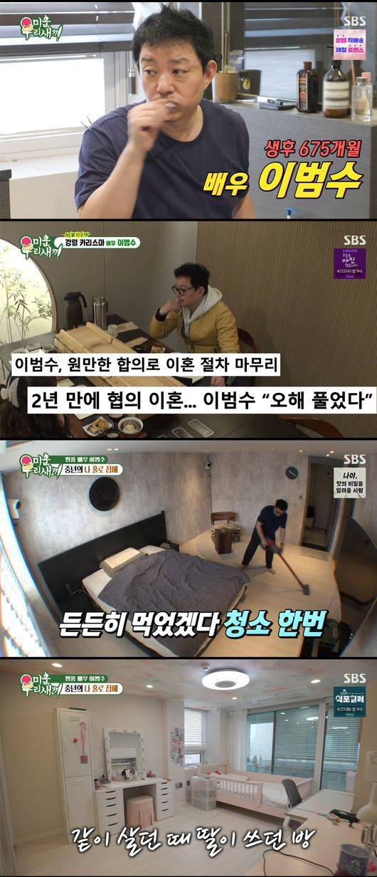 12일 방송된 SBS '미운 우리 새끼'에서는 최근 합의 이혼 소식을 알린 이범수가 새 멤버로 합류, 홀로 지내는 일상을 처음으로 공개했다.