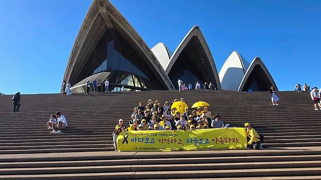 | ▲ 세월호 참사 12주기를 맞은 지난 12일(현지시간), 호주 시드니 오페라하우스 앞 광장에 모인 한인 동포들이 희생자들을 추모하기 위해 모였다. |