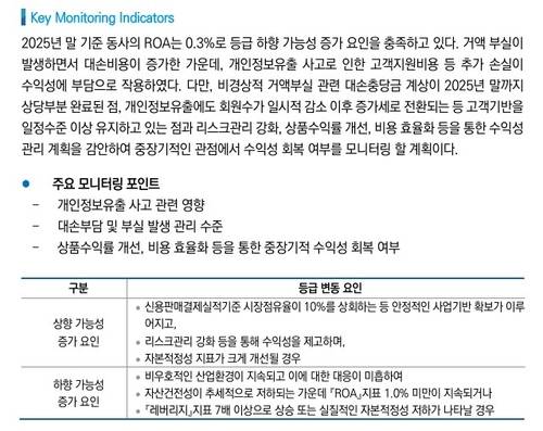 한기평은 '영업정지에 따른 신규 영업 제한으로 인해 실적 반등 시점이 지연될 가능성이 커졌다"며 "비용 효율화 및 위험 관리 강화 등을 통해 수익성 회복 기반을 확보할 수 있을지를 중점적으로 점검할 계획이다"고 강조했다.