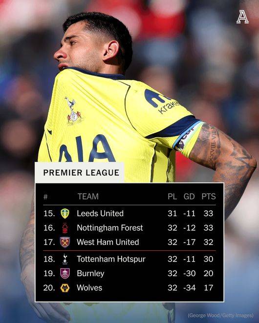 토트넘도 현재 18위로 떨어지면서 정말로 강등권까지 추락했다. 승점 30점으로 같은 라운드 울버햄튼을 격파한 웨스트햄 유나이티드(승점 32)에 17위 자리를 내줬다.