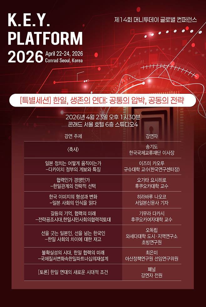 국제질서의 급변, 미국의 자국우선주의, 공급망 재편, 중동 리스크, 기술 패권 경쟁이 한꺼번에 파도처럼 밀려오는 시대에 한일은 공통의 압박을 받는 두 중견국이 됐다. 이런 상황에서 한일관계는 기존처럼 과거사에 대한 기억만으로는 설명되지 않는다. 머니투데이가 오는 23일 서울 여의도 콘래드서울 호텔에서 개최하는 제14회 글로벌 콘퍼런스 '2026 키플랫폼'(K.E.Y. PLATFORM 2026)에서 일본 특별세션 '한일, 생존의 연대: 공통의 압박, 공동의 전략'을 내건 이유도 여기에 있다. 이 세션은 한일관계를 더 이상 감정의 프레임이 아니라 전략의 프레임으로 읽어야 한다는 문제의식 위에 있다.