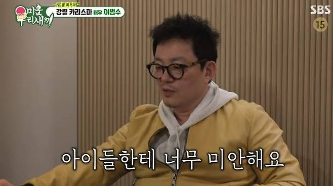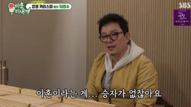 지난 12일 방송된 SBS '미운 우리 새끼'에서는 최근 합의 이혼 소식을 알린 배우 이범수가 합류해 홀로 보내는 일상을 최초 공개했다. 이날 오랜만에 시청자들을 만난 이범수는 근황에 관해 "많은 분이 아시겠지만 한 2~3년 개인사가 있었다. 개인적으로 슬프고 아픈 기간이었는데 얼마 전에 잘 해결됐다"고 힘들었던 시간을 입에 올렸다. 이어 그는 "이혼이라는 게 승자가 없다. 둘 다 아프다. 아이들한테 너무 미안했다. 가족들에게 아픔을 남긴 셈"이라고 묵힌 감정을 털어놓아 안타까움을 자아냈다.