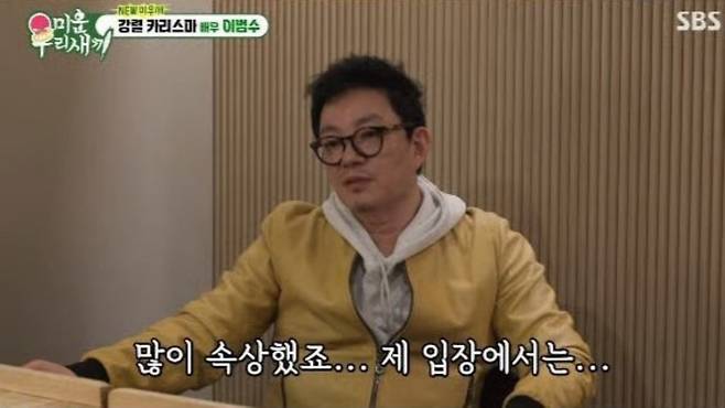 이범수는 많은 관심을 받았던 이혼 과정에서 따라붙은 오해들에 무거운 심경을 밝히기도. 그는 "많이 속상했다. 저로서는 침묵하길 잘한 것 같다. 아이들한테 미안해서 가만히 있고 싶더라"고 솔직하게 털어놓은 한편 "좋은 일도 아닌데 튀고 싶지 않았다. 애들한테 미안해 죽겠다"고 속상한 마음을 드러냈다.
