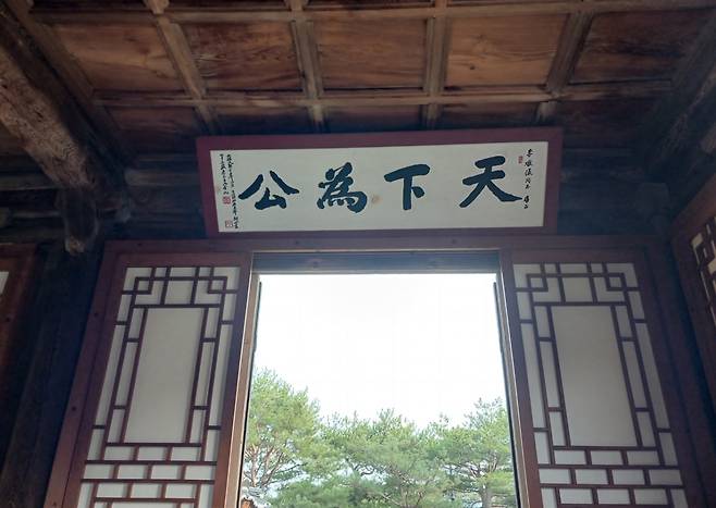 | ▲ 활래정에 내걸린 김구 선생 편액(휘호 ‘천하위공’은 ‘세상은 공평하고, 사람의 마음은 의연하다’는 뜻이라 한다) |