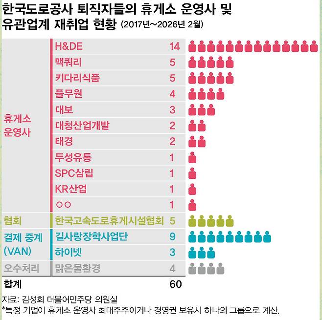 한겨레21이 김성회 더불어민주당 의원실을 통해 도로공사에서 제출받은 자료를 바탕으로 휴게소 운영사 등기부등본 취재, 10명에 이르는 휴게소 업계 관계자 인터뷰 등을 종합해 2017년부터 2026년 2월까지 10년 동안 도로공사 퇴직자 취업 사례를 전수조사한 결과, 도로공사 퇴직자가 운영사 등 휴게소 관련 회사에 재취업하거나 지분을 보유한 사례, 이권 사업체를 창업한 사례를 합치면 최소 60명에 달하는 것으로 확인됐다.