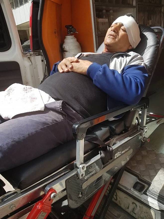 | ▲ UNOCHA 촬영 2022년 3월 24일, 서안지구 내부에 건설된 유대인 마을의 주민들로부터 공격당한 팔레스타인인이 부상을 입고 구급차로 이송되는 모습이다. 피해자의 증언에 따르면, 도끼로 머리와 등을 가격당했다. |