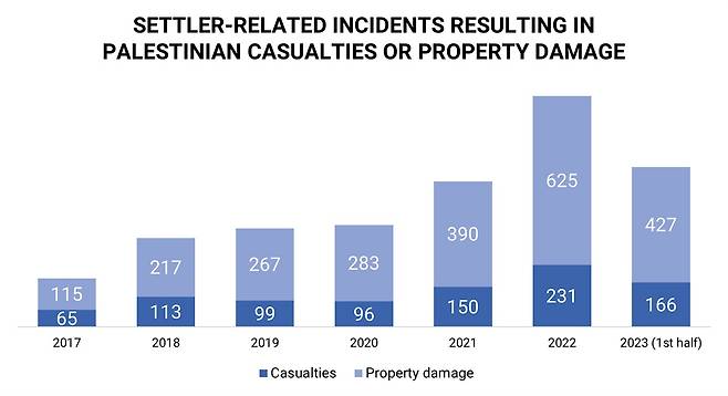 | ▲ UNOCHA 통계 서안지구 내에 건설된 이스라엘의 유대인 마을 주민들이 팔레스타인인들에게 입힌 인적·물적 피해 빈도 |