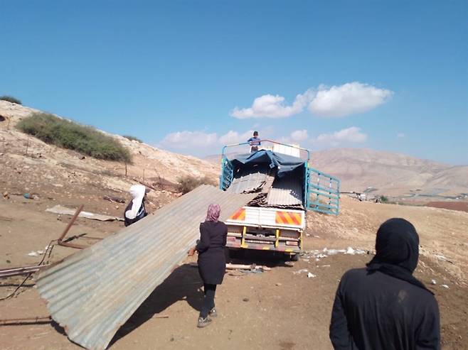 | ▲ UNOCHA 촬영 2023년 10월, 서안지구 내부에 건설된 유대인 마을 주민들로부터 살해 위협을 받고 팔레스타인 주민들이 피란하고 있다. |