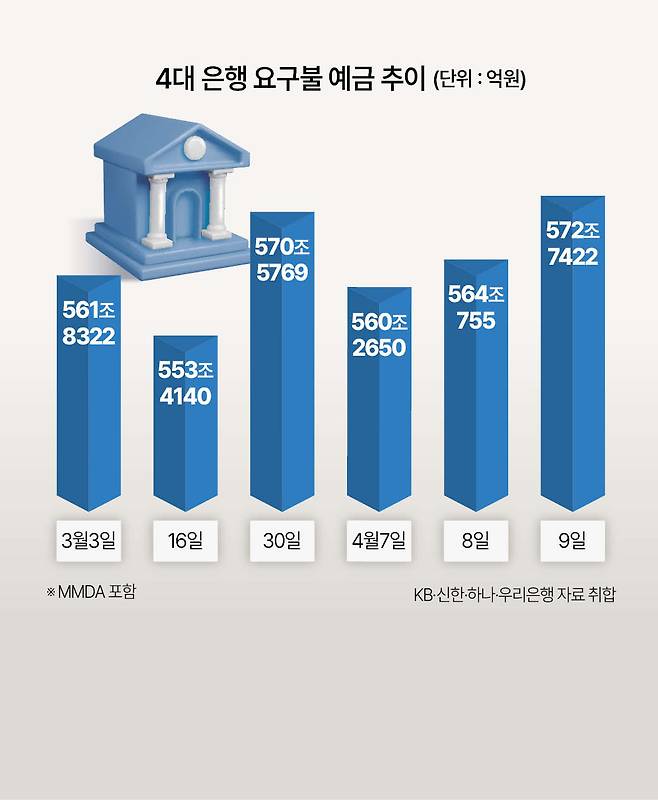 13일 은행권에 따르면 KB·신한·하나·우리 등 4대 은행의 요구불예금(MMDA 포함)은 지난 7일 560조2650억원에서 8일 564조755억원으로 하루 만에 3조8105억원이 늘었다. 9일엔 572조7742억원으로 8조6987억원 늘며 증가폭이 더 커졌다.