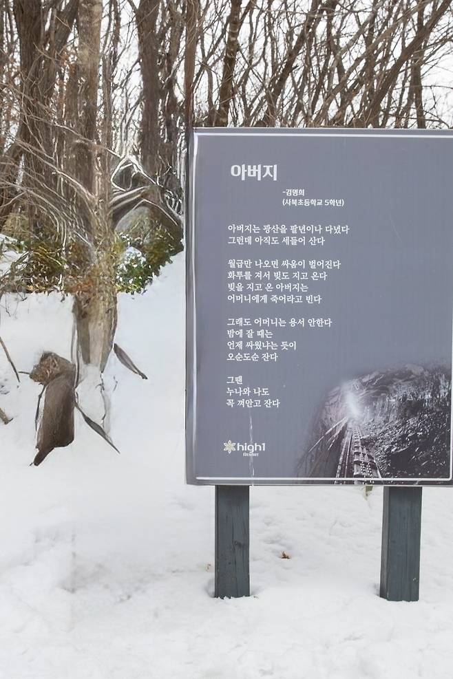 | ▲ 2024년 2월 강원랜드 하이원 리조트에 있는 초등학생의 시 '아버지'가 오가는 시민들에게 사북의 기억을 떠올리게 한다. |