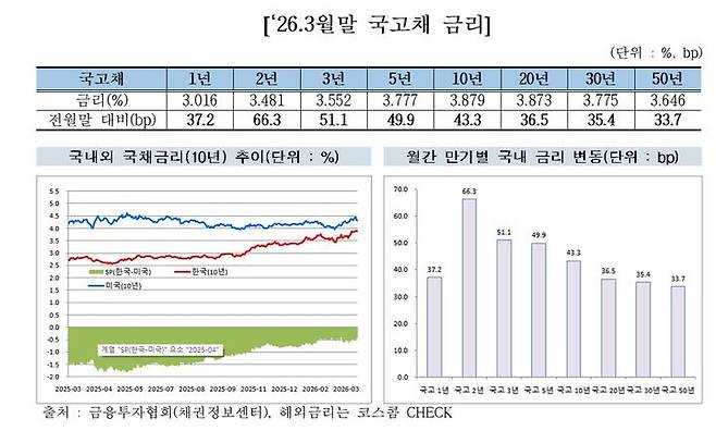 3월 말 3년물 국고채 금리는 3.552%로 한 달 전보다 51.1bp(1bp=0.01%포인트) 상승했다. 5년물은 49.9bp 오른 3.777%, 10년물은 43.3bp 오른 3.879%였다.