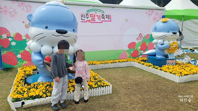 포토존 쪽으로 걸어가면 커다란 파란 수달 인형이 먼저 눈에 들어왔습니다. 노란 팬지꽃이 흰 울타리 안에 가지런히 둘러져 있었고, 그 앞에 선 아이들 표정은 꾸미지 않아 더 환했습니다.