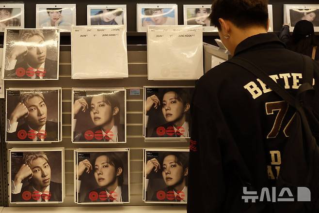 [서울=뉴시스] 김혜진 기자 = 13일 서울 중구 명동 케이메카 명동본점에서 외국인 관광객들이 BTS 앨범 등 굿즈를 살펴보고 있다.