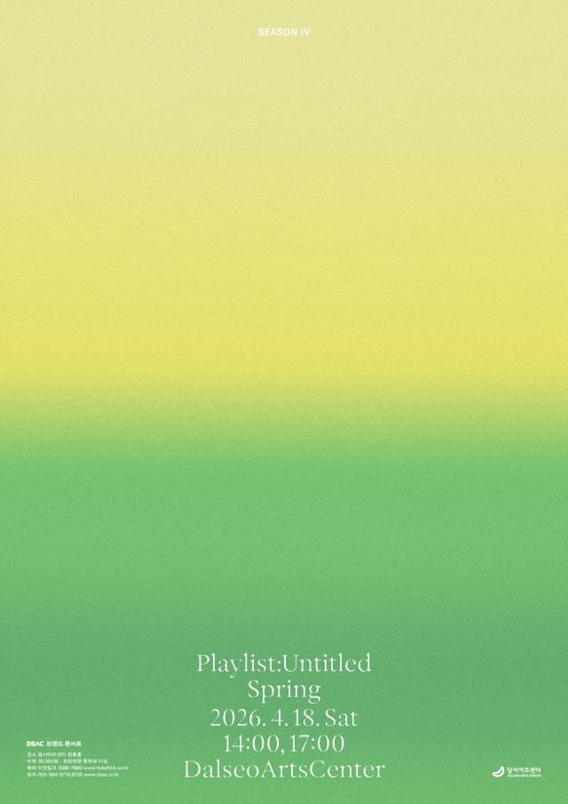 3년 연속 전 회차 매진을 기록한 달서아트센터의 대표 브랜드 콘서트 '플레이리스트 : 언타이틀'이 네 번째 시즌으로 돌아온다. 오는 18일(토) 봄 공연을 시작으로 6월 20일(토·여름), 9월 19일(토·가을), 12월 19일(토·겨울)까지 총 4회에 걸쳐 사계절의 서사를 선보인다.