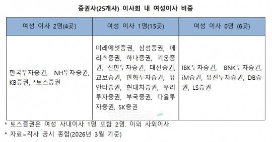 국내 자기자본 상위 증권사 25곳의 이사회 여성이사 비중이 14%에 머무는 것으로 나타났다.