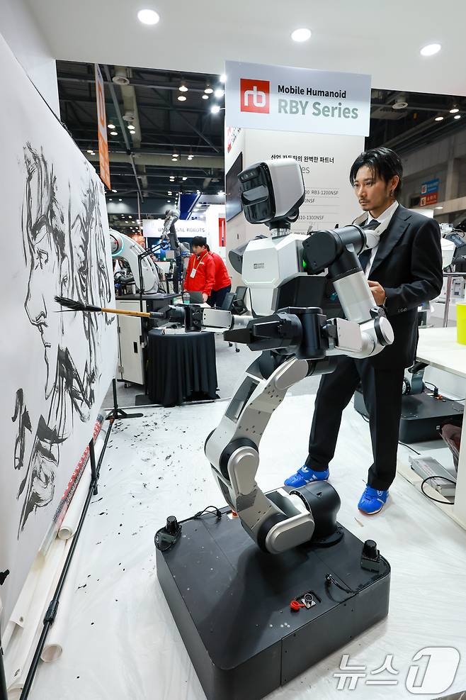 (고양=뉴스1) 안은나 기자 = 염동균 작가가 13일 경기 고양시 일산서구 킨텍스에서 열린 서울국제생산제조기술전(SIMTOS 2026) 로봇 및 디지털제조기술 특별전 레인보우로보틱스 부스에서 RB-Y1 모바일 양팔 매니퓰레이터와 아트 퍼포먼스를 선보이고 있다.