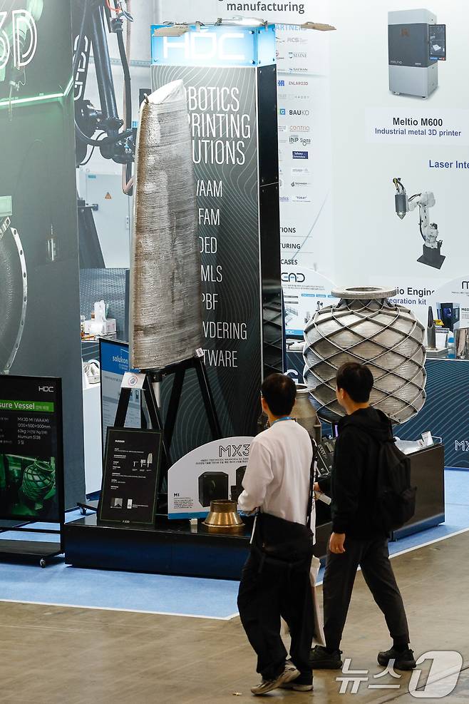(고양=뉴스1) 안은나 기자 = 13일 경기 고양시 일산서구 킨텍스에서 열린 서울국제생산제조기술전(SIMTOS 2026) 로봇 및 디지털제조기술 특별전을 찾은 관람객이 HDC MX3D 대형 금속 3D 프린팅 제품을 살펴보고 있다.