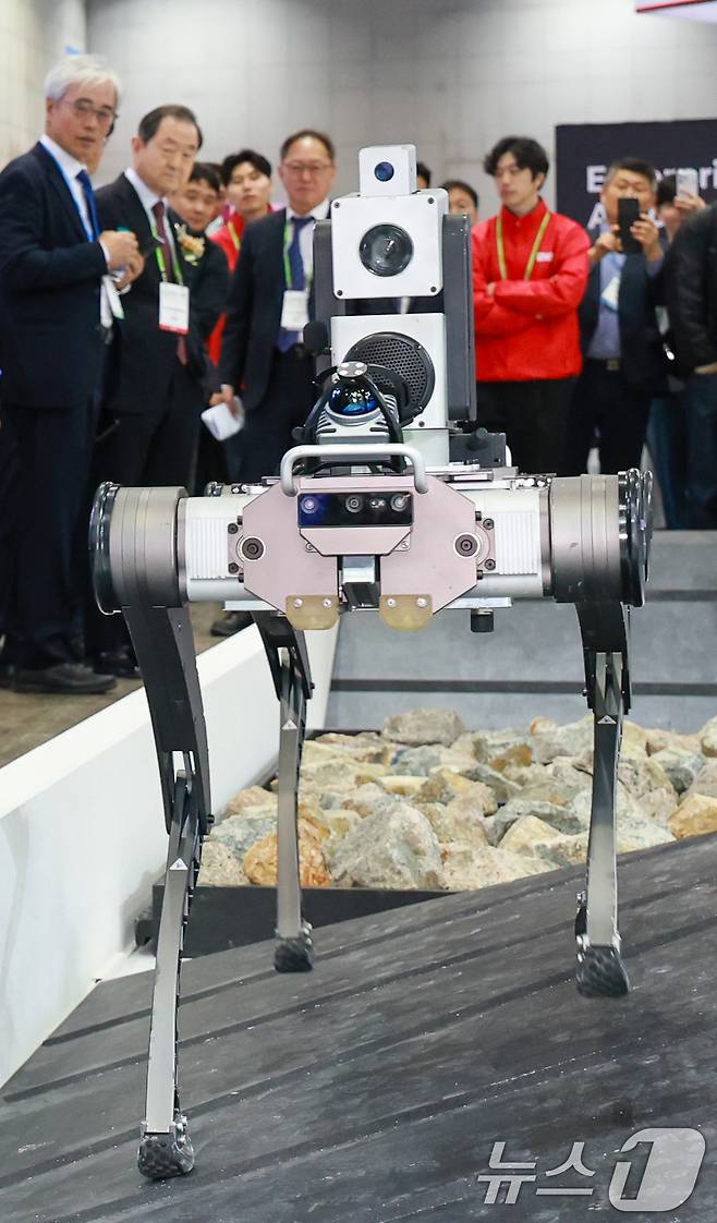 (고양=뉴스1) 안은나 기자 = 13일 경기 고양시 일산서구 킨텍스에서 열린 서울국제생산제조기술전(SIMTOS 2026) 로봇 및 디지털제조기술 특별전 레인보우로보틱스 부스에서 사족보행 로봇 시연이 펼쳐지고 있다.
