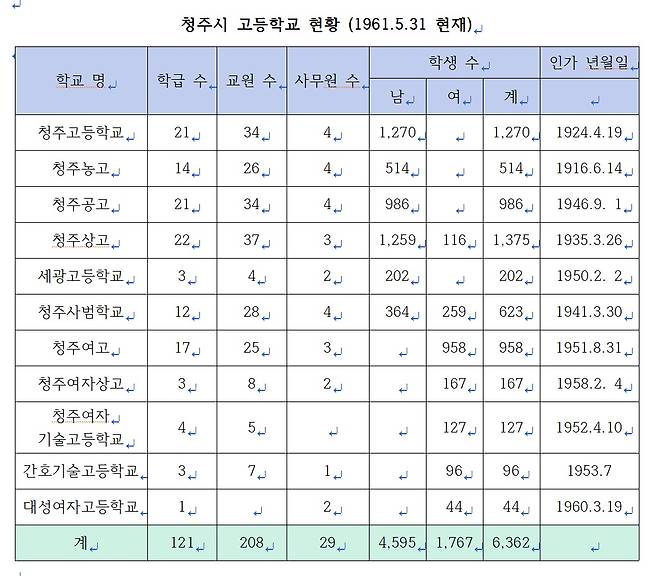 | ▲ 청주시 고등학교 현황 1960년 당시 청주고등학교 현황 |