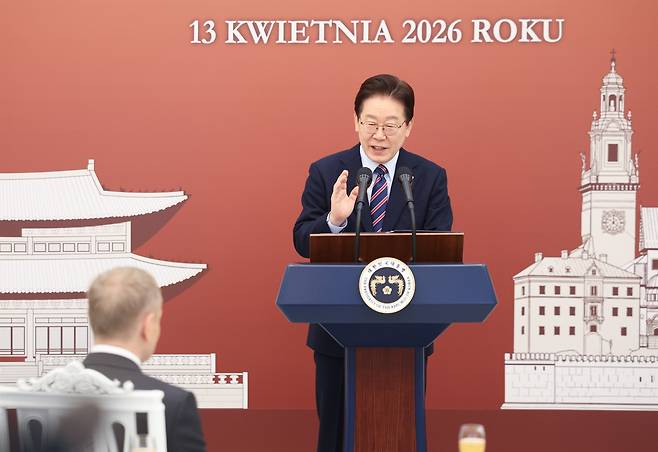 | ▲ 이재명 대통령이 13일 청와대에서 열린 도날드 투스크 폴란드 총리 공식 방한 환영 오찬에서 환영사를 하고 있다. 2026.4.13 [청와대통신사진기자단] |