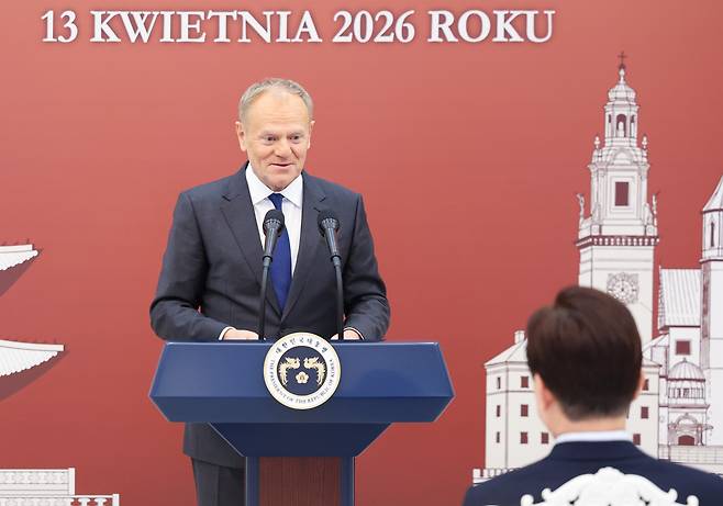 | ▲ 도날드 투스크 폴란드 총리가 13일 청와대에서 열린 이재명 대통령 주최 공식 방한 환영 오찬에서 답사하고 있다. 2026.4.13 [청와대통신사진기자단] |