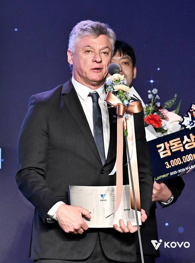 남녀부 파이널 우승을 거둔 GS칼텍스 이영택 감독과 헤난 달 조토(대한항공) 감독이 13일 오후 서울 광진구 그랜드 워커힐 비스타홀에서 열린 2025-26시즌 진에어 V-리그 시상식에서 감독상을 수상했다.