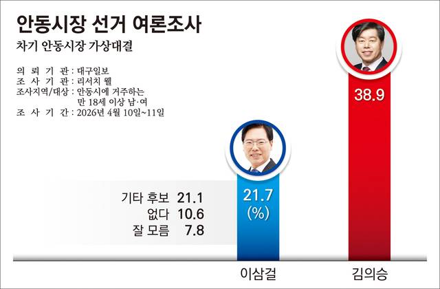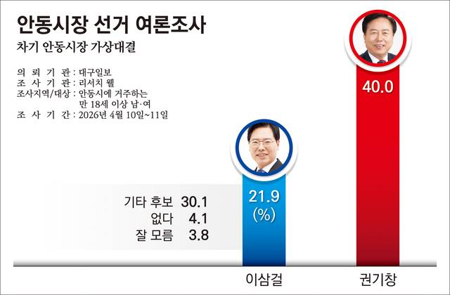 대구일보가 여론조사회사인 리서치웰에 의뢰해 지난 10~11일 안동시에 거주하는 만 18세 이상 남녀 500명을 대상으로 실시한 조사에서 권기창 안동시장과 더불어민주당 이삼걸 전 경북도 행정부지사 간 가상대결에서는 권기창 40.0%, 이삼걸 21.9%로 집계됐다. 두 후보 간 격차는 2배 가까이인 18.1%포인트로 나타났다.