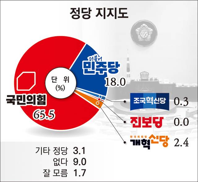 이어 지지 정당 없음 9.0%, 기타 정당 3.1%, 개혁신당 2.4%, 조국혁신당 0.3% 순으로 나타났다.