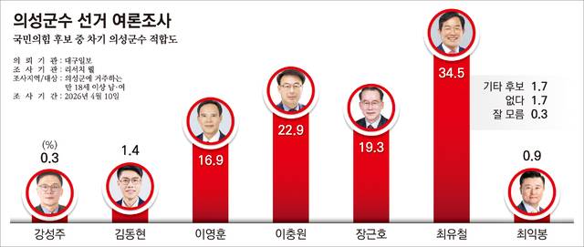 6·3 지방선거를 앞두고 실시된 경북 의성군수 후보 적합도 조사에서 최유철 전 의성군의회 의장이 30%대 중반의 지지로 의성군수 전체 적합도와 국민의힘 후보 적합도 모두 '선두'를 달리고 있는 것으로 나타났다. 다만 2·3위권 후보들이 20% 안팎의 지지율로 뒤를 추격하며 '1강 다중 추격' 구도가 형성된 양상이다.