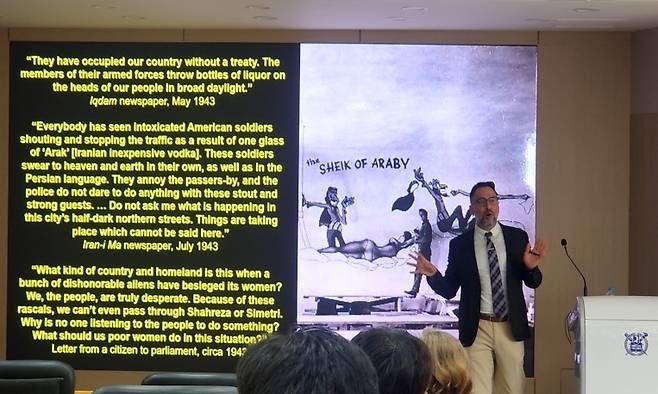 [13일 오후 서울대 관악캠퍼스에서 이란계 정치학자인 시아바시 사파리 아시아언어문명학부 교수가 미국과 이란의 관계를 주제로 특별강연을 진행하고 있다. (사진=연합뉴스)]