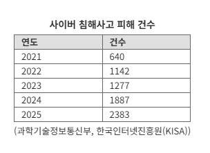 13일 과학기술정보통신부 및 한국인터넷진흥원(KISA)에 따르면 지난해 사이버 침해 사고 신고 건수는 2024년 1887건에서 2025년 2383건으로 전년 대비 26.3% 증가했다. 2021년(640건)과 비교하면 4년 새 272%나 급증했다.