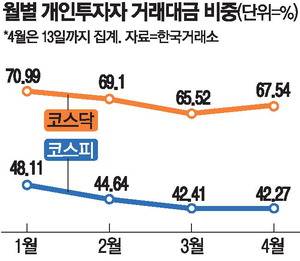 수급 흐름도 달라지고 있다. 지난 1월 48.11%까지 치솟았던 개인투자자의 코스피 거래대금 비중은 지정학적 불확실성이 본격화한 지난 3월 42.41%까지 낮아졌다. 이달에도 전월보다 0.14%포인트 줄어든 42.27%를 기록하고 있다. 반대로 코스닥시장에서는 개인투자자의 거래대금 비중이 지난 3월 65.52%까지 내려갔지만 이달 들어 67.54%로 2.02%포인트 반등한 상태다.