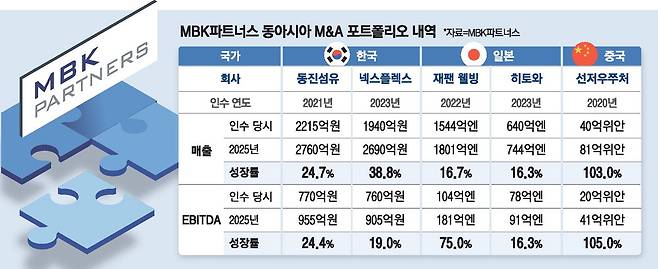 한국 시장에서는 의류 소재 전문기업 동진섬유와 연성동박적층판(FCCL) 제조업체 넥스플렉스의 성장이 두드러진다. 2021년 인수 당시 매출 2215억원, 상각전영업이익(EBITDA) 770억원이었던 동진섬유는 2025년 현재 매출 2760억원, EBITDA 955억원으로 각각 24.7%, 24.4% 성장했다. 2023년 포트폴리오에 편입된 넥스플렉스 역시 매출이 인수 당시 1940억원에서 2025년 2690억원으로 2년 만에 38.8% 급증했다.