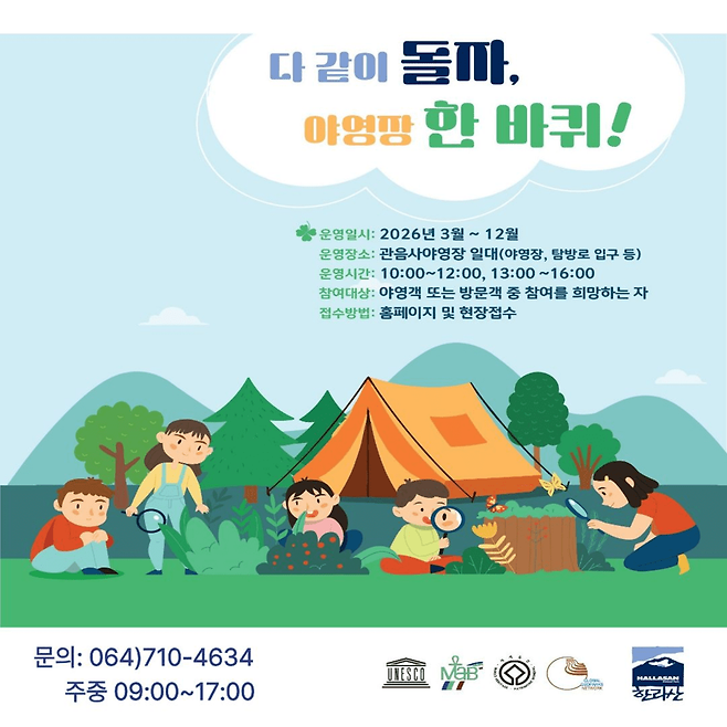 '다 함께 돌자, 야영장 한바퀴!'는 관음사야영장 일대에서 에코엔티어링 방식으로 운영되는 생태 체험 프로그램이다. 에코엔티어링은 '자연(Eco)'과 '오리엔티어링(Orienteering)'을 결합한 단어다. 생태 미션을 스스로 해결하며 판단력과 통찰력을 키우는 생태 활동이라고 설명한다. 참가자들은 한라산에서 자연·환경과 관련된 미션을 수행한다. 어린이와 일반으로 구분해 운영하며, 개인과 단체 모두 참여 가능하다.