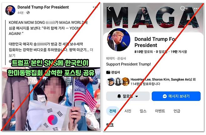 도널드 트럼프 미국 대통령이 자신의 소셜미디어에 한국의 '윤(석열) 어게인' 집회 참석자 사진을 공유하면서 지지 의사를 밝혔다는 허위조작정보가 '친윤' 누리꾼 사이에 확산됐다.