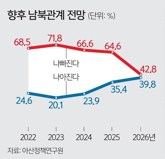 “가장 적대적인 국가”로 한국을 꼽는 등 북한의 노골적인 적대정책이 한층 날카로워지고 있지만 향후 남북 관계가 나빠질 것이란 우리 국민들의 전망은 지난해에 비해 현저히 낮아졌다는 조사 결과가 나왔다. 자체적으로 핵무기를 보유해야 한다는 의견은 80%에 달해 역대 최고치를 기록했다. 아산정책연구원은 이 같은 결과를 토대로 작성한 ‘2026년 한국인의 주변국 인식’ 보고서를 지난 8일 발표했다. 조사는 지난 2월 7∼11일 전국 18세 이상 성인남녀 1000명 대상으로 진행됐다.