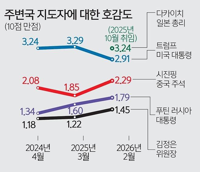 올해 한국인에게 가장 호감도가 높은 이웃나라는 미국, 가장 낮은 나라는 러시아였다. 미국 호감도는 5.90점(0점 가장 비호감∼10점 가장 호감)으로 2015년부터 가장 높은 호감도를 유지했다. 일본 호감도는 2025년 4.52점에서 2026년 5.11점으로 조사 이래 처음으로 중립 기준선인 5.0을 넘겼다. 올해 1월 한·일정상회담 등 양국 관계 개선 흐름이 반영된 것으로 해석된다. 중국(3.28), 북한(3.37), 러시아(2.86) 에 대한 호감도는 전반적으로 낮은 수준에 머물렀다. 북한은 지난해 2.56점으로 호감도가 다섯 나라 중 가장 낮았지만 올해 3.37점으로 상승해 호감도 꼴찌를 면했다.