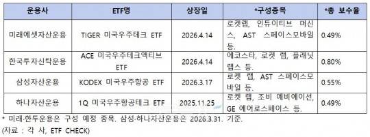 하나자산운용도 지난해 11월 미국 우주 및 항공테크 대표기업에 집중 투자하는 ‘1Q 미국우주항공테크 ETF’를 상장했다.