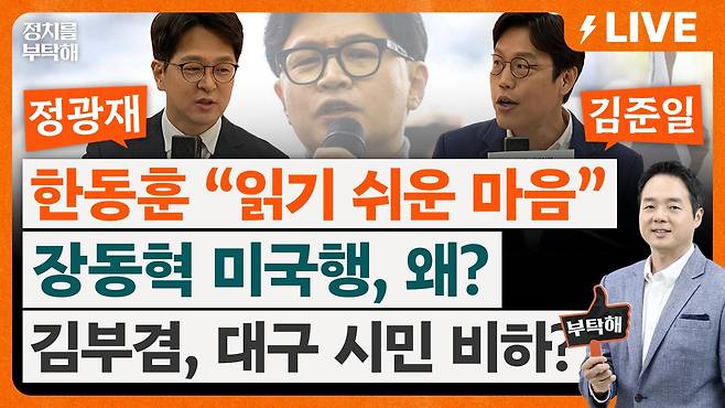 ▷강경석: 아니 지금 저희 시청자분 중에 또 리도람 분은 리도람입니다. 슈퍼챗을 남기면서 이렇게 표현을 하셨어요. 지금까지는 2번 찍었는데 이번에는 1번 찍을 거다. 이게 부산 시민의 마음이다. 뭐 어쨌든 지금 장동혁 대표에 대한 목소리들이 여러 가지가 나오고 있는 가운데 당내에서도 사실 지금 선거 포기한 거냐 이런 비판의 목소리가 거셉니다. 저희가 배현진 서울시당 위원장, 페이스북에 이렇게 썼습니다. 왜 이 시점에 미국에 갔는지 모르겠는데 최소한 시도당 운영위가 의결해서 올리는 공천안은 의결해야 되는 거 아니냐 민주당 정청래 전국을 휩쓸고 있는데 지금 불러주는 곳 없다고 공천 스톱시키고 미국 가는 당 대표를 누가 이해하겠냐 이렇게 얘기를 했습니다. 이거에 대해서 이제 오늘 박성훈 수석 대변인이 이렇게 얘기를 했어요. 아니 이거 뭐 공천에 일정이 미뤄졌다고 주장을 하는 거에 대해서 어떻게 생각하냐 답변이 사실관계를 명확히 알지 못하고 한 거다. 최고위에서는 바로 이제 그런 공천 과정의 적절성과 적합성 모두 다 검토하는 절차를 거치는 거고 이거는 정치적 의도를 갖고 지도부를 흔들거나 하는 발언이다 이렇게 지적을 했는데 사실 뭐 저희가 이런 절차를 정확히 알 수는 없으나 장동혁 대표가 원래는 강원도도 가는 일정이 있었고 했는데 인천에서 처음 현장 최고위 갔다가 의원들, 당협위원장들 이거 지금 선거 이렇게 치를 거냐 막 항의를 하니까 지방 일정을 취소하긴 했단 말이죠. 사실 장동혁 대표가 미국 가면 이런 비판이 나올 걸 뻔히 알긴 알았을 텐데 그럼에도 불구하고 출국을 했습니다. 결국엔 한동훈 전 대표가 사실 또 비교가 될 수밖에 없는 게 저희가 또 사진을 하나 준비해 봤는데 이 출국하는 장동혁 대표와 그리고 지금 전국을 돌면서 저렇게 지방에서 선거 운동은 아니겠지만 어쨌든 국민들을 만나고 다니는 한동훈 전 대표가 이렇게 비교가 될 수밖에 없는 상황인데 정 위원님이 보셨을 때는 이거 뭐 장동혁 대표가 도움을 오히려 주는 거 아닌가요? 한동훈 전 대표한테 보수의 어떤 좌장 보수 세력의 어떤 지금 선거를 준비하는 이 마음가짐 이런 것들이 대비가 될 수밖에 없어 보이지 않나요?