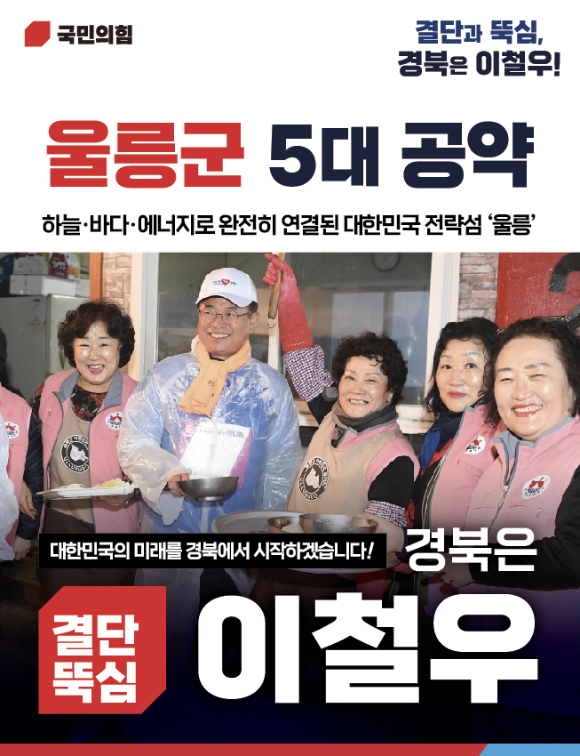 이철우 예비후보는 “울릉은 단순한 관광지가 아니라 대한민국의 미래를 시험할 수 있는 가장 상징적인 공간”이라며, “하늘길과 바닷길을 완성하고 산업과 삶의 구조를 함께 바꿔 울릉을 반드시 사람이 돌아오는 섬, 자립하는 섬으로 완성하겠다”고 역설했다.