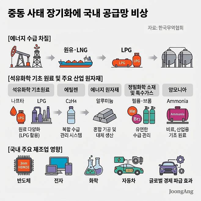 미국-이란 종전 협상 결렬 후 미국이 호르무즈해협 역(逆)봉쇄에 나서면서 국내 산업계가 고육책을 내놓고 있다. 중동 사태가 장기화로 고유가와 물류 불안이 상수가 되면서 공급망 확보를 위한 단기 처방마저 한계에 다다랐다는 분석이 나온다.