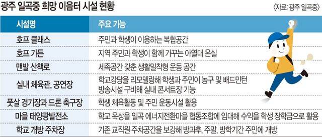 최인주 광주교육청 시설과장은 “(일곡중 일대는) 마을 공동체가 활성화된 곳이다. 학교복합시설은 학교와 지역사회 요구를 반영한 ‘바텀 업’(상향식) 방식으로 진행하고 있어 학생과 지역 주민 만족도가 높다. 매년 1곳 이상은 비슷한 시설을 늘릴 계획”이라고 말했다.