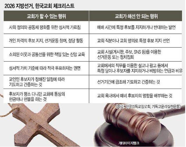 지방자치단체장과 지방의회의원을 뽑는 전국동시지방선거를 50일 앞두고 교계가 정치적 중립과 공직선거법 준수를 강조하는 대응에 나섰다. 교회 공간에서의 선거 관련 행위가 자칫 위법 논란으로 이어질 수 있기에 사전에 이를 막으려는 노력이다. 교단과 시민단체는 공직선거법 준수 캠페인을 통해 구체적 금지 사례와 허용 범위 등을 안내하며 교회 현장의 혼선을 줄이고 있다.