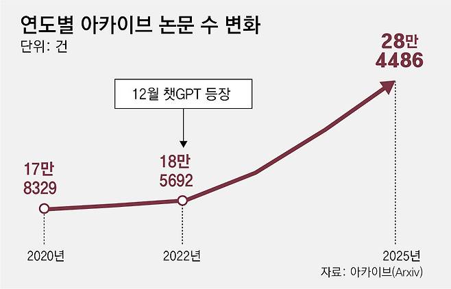 13일 과학계에 따르면 AI의 등장 이후 논문 제출은 폭증하고 있다. 미국 코넬대가 운영하는 논문 사전 게재 사이트인 ‘아카이브(arXiv)’에 올라온 논문 수는 지난해 기준 2022년 챗GPT 등장 이전의 1.5배 이상으로 증가했다. 올해 3월에는 월간 3만 편 이상의 논문이 게재되며 역대 최고치를 경신했다. 올해 연간 투고량은 30만 편을 넘어설 것으로 예상된다.