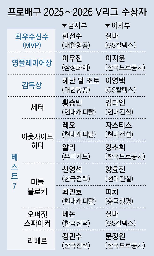13일 서울 광진구 그랜드워커힐호텔에서 열린 프로배구 2025∼2026 V리그 시상식에서 정규리그 최우수선수(MVP)로 뽑힌 남자부 대한항공 한선수(왼쪽), 여자부 GS칼텍스 실바가 트로피를 들고 활짝 웃고 있다. 뉴스1
