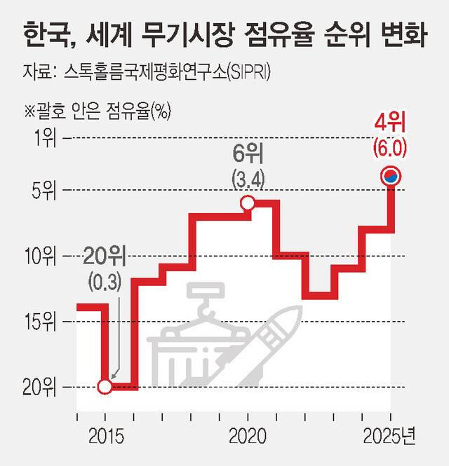 한국이 지난해 글로벌 무기 수출시장 점유율에서 세계 4위에 오른 것으로 확인됐다. 러시아의 우크라이나 침공 이후 재무장에 들어간 유럽 국가 등과 초대형 무기 공급 계약을 따내며 가파르게 성장한 결과다. 미국·이스라엘-이란 전쟁에서도 중동 국가에 실전 배치된 한국 방공무기 신뢰성이 입증되며 올해에도 케이(K)방산 성장세는 계속될 전망이다. 다만 수출 무기 성능·규모·대상국이 빠르게 늘면서, 한국이 국제 분쟁과 전쟁, 인권 침해 등에 간접 개입하거나 지원하는 상황이 잦아질 것이라는 우려가 나온다.